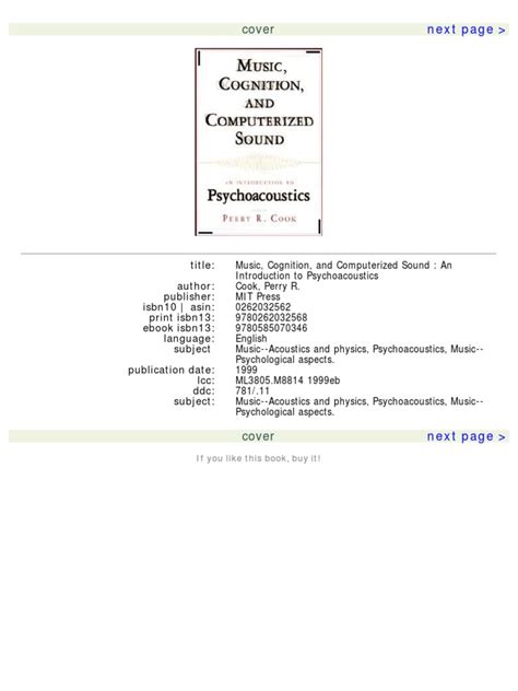 Read Online Music Cognition and Computerized Sound An Introduction to Psychoacoustics MIT Press Reader online is a convenient and frugal way to read Music Cognition and Computerized Sound An Introduction to Psychoacoustics MIT Press you love right from the comfort of your own home. Yes, there sites where you can get Reader "for free" but the ones listed below are clean from viruses and completely legal to use.